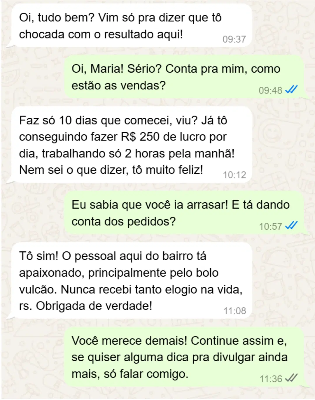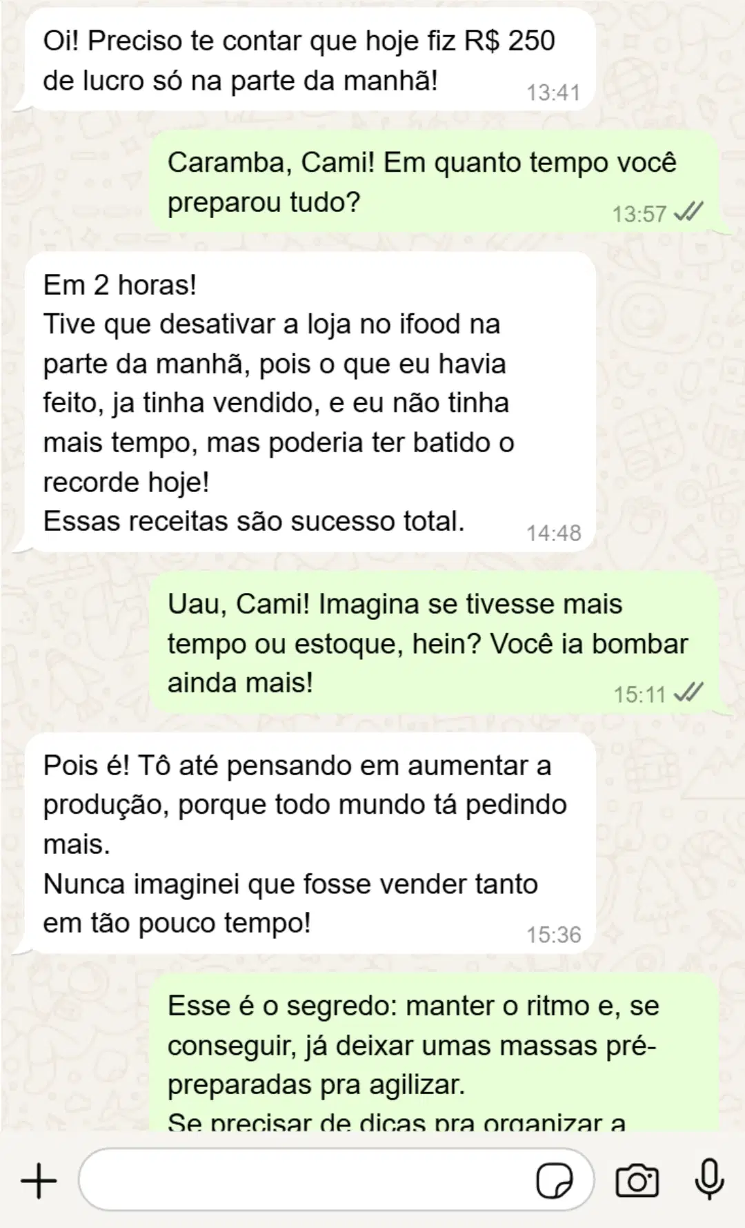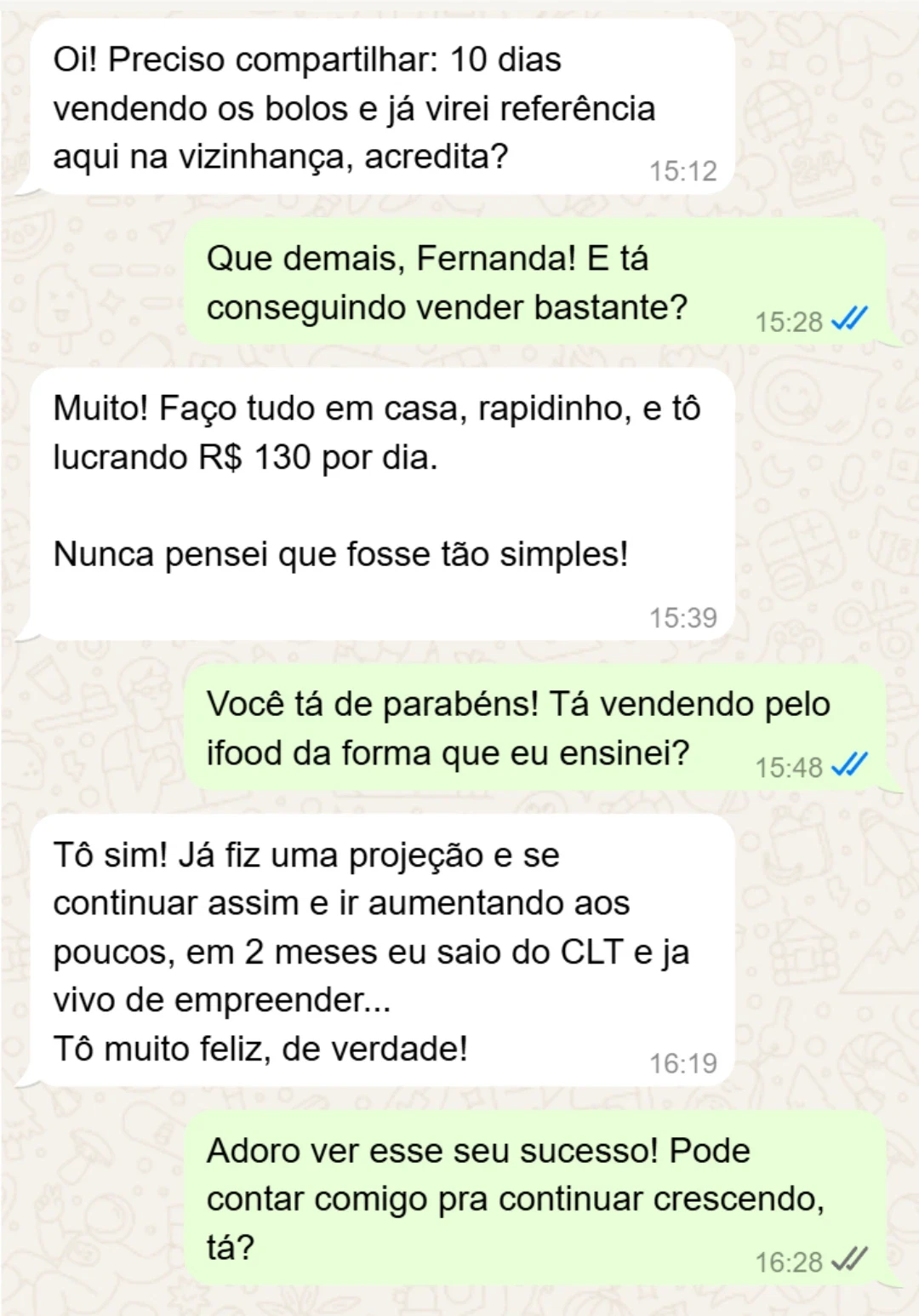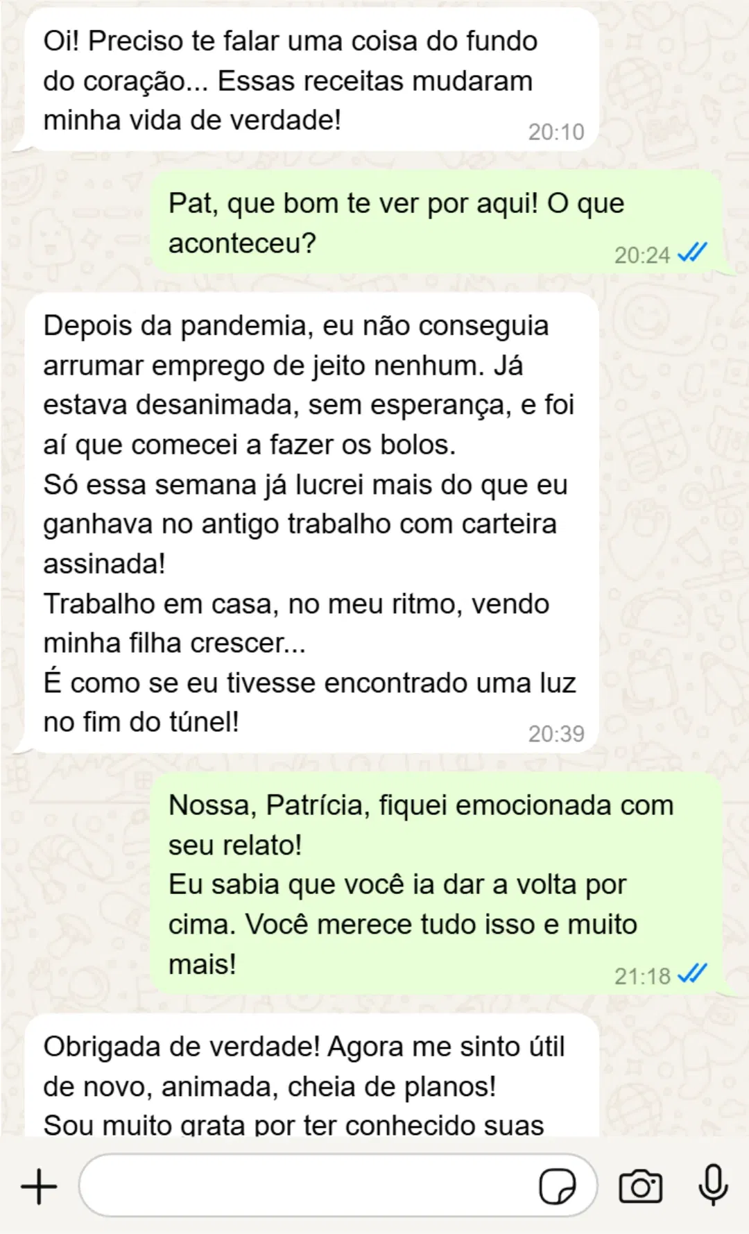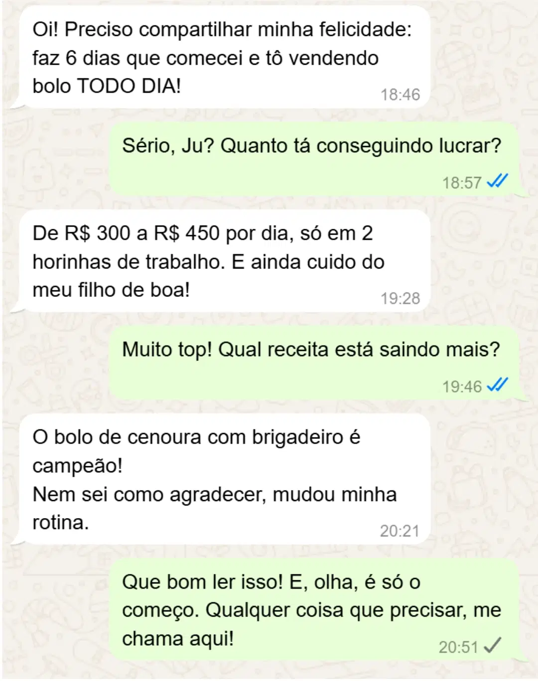 Depois de anos aperfeiçoando receitas e estratégias de venda, criei um método que já transformou a vida de mais de 3.500 mulheres em todo o Brasil.